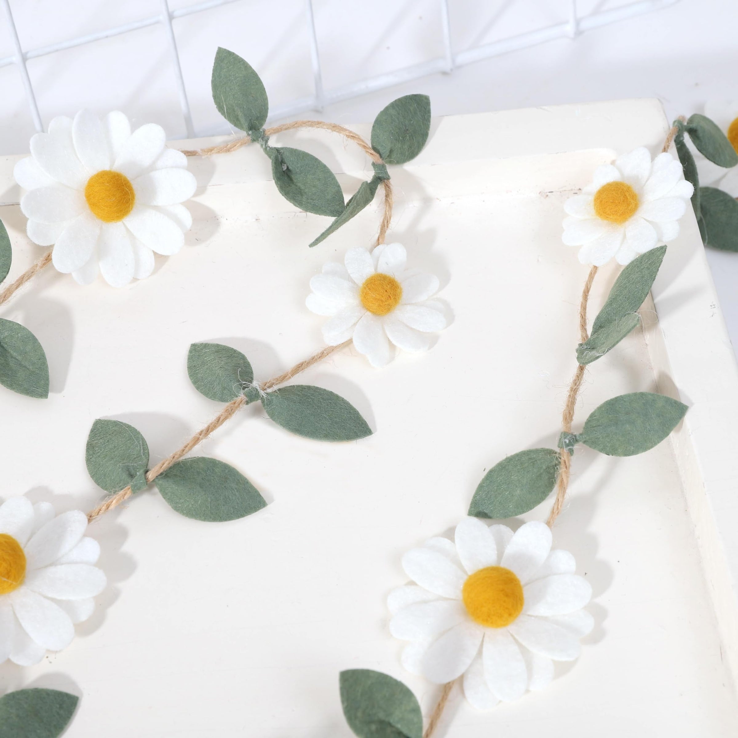 Wool Felt Daisy Chain Banner Garland - Daisy Decorations, Daisy Themed Party Decorations, Nursery Wedding Decoration, White Wool Felt Daisy Green Leaf Garland